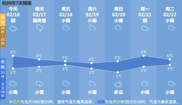据浙江省气象台2月16日16点发布的全省天气预报:今天傍晚到夜里全省阴有时有小雨,夜里西部山区有雨夹雪或小雪。