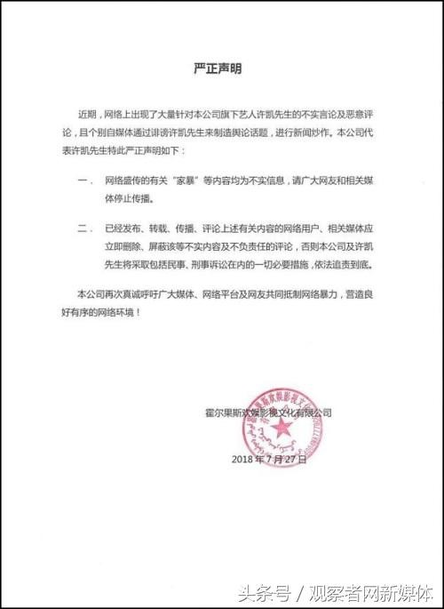 声明中表示,近日网上出现了许多关于许凯的不实言论及恶意评论,通过诽谤许凯的方式进行舆论炒作,故而声明,“家暴”等言论为不实传言,请大家立即停止传播,并删除、屏蔽已传播的内容,否则将采取法律手段进行维权,追查到底。