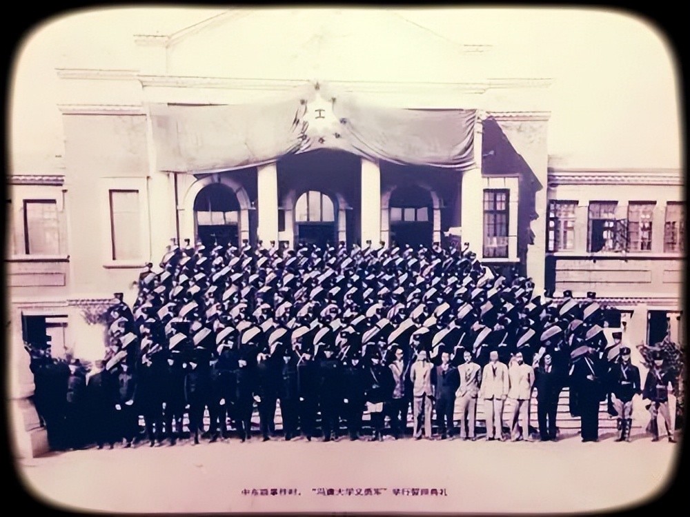 冯庸大学义勇军誓师典礼。该校在当时知名度很高,曾组织学生抗日义勇军参加淞沪会战、热河抗战等。