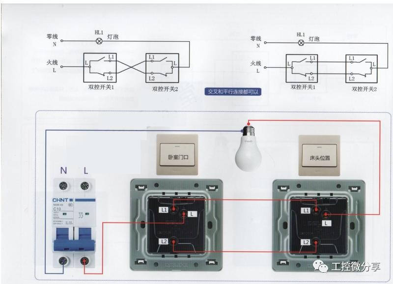 两个开关可以放在楼梯的上下两端,或走廊的两端,这样可以在进入走廊前开灯,通过走廊后在另一端关灯,既能照明,又能避免人走灯不灭而浪费电。