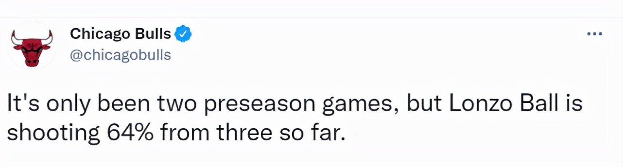 北京时间10月11日,芝加哥公牛更新官方社媒,晒出了球哥(朗佐-波尔)的照片,并配文写道:“刚打了两场季前赛,但朗佐-波尔的三分命中率高达64%。”
