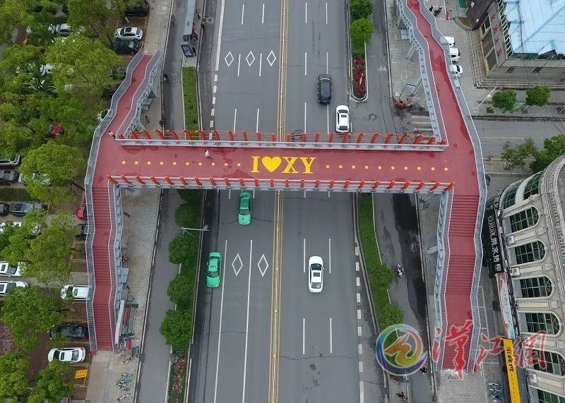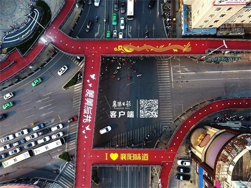 5月26日航拍的襄阳市永安广场天桥,桥面涂装的襄阳元素格外醒目。全媒体记者谢勇摄