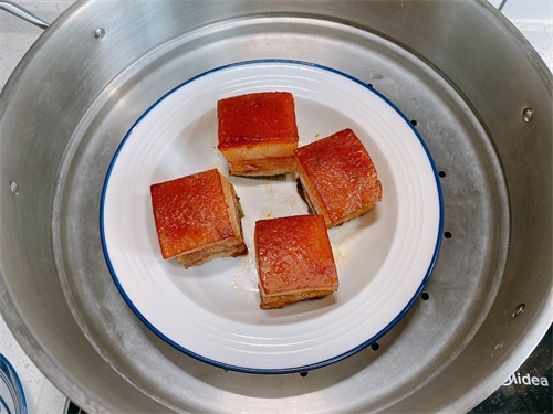 8、一个半小时之后,把炖好的五花肉捞出来,放在一个小锅或者盘里,皮朝上,放在锅中再蒸半小时,这样蒸出一部分油脂,吃起来会更加油而不腻,还有是因为炖是收缩的过程,蒸是膨发的过程,炖好之后再蒸,口感会更软糯形状也更好看;