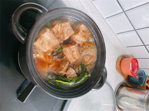 7、砂锅先大火煮开,大火先煮10分钟,然后转小火慢炖1个半到2个小时,具体的根据肉块大小来决定,炖的途中可以给肉翻面,这样上色更加均匀;