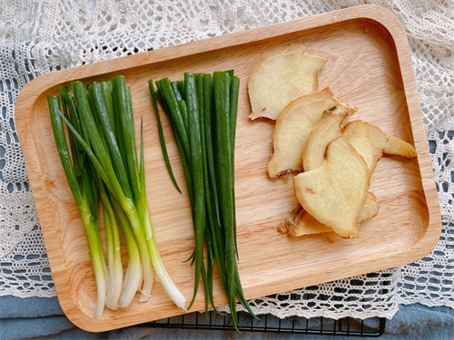 4、煮肉的时候来准备配菜,首先就是小葱,小葱的用量要多一点,放在砂锅底部除了防止肉糊锅,还能增香,清洗干净的小葱可以切成2段,准备好的生姜切成片;