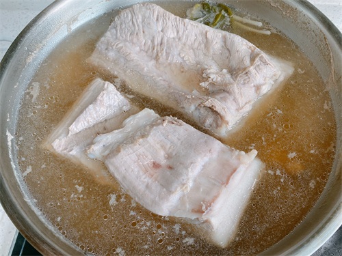 3、处理好的五花肉冷水下锅,加入葱、姜、料酒去腥,大火煮开,煮开之后撇去浮沫,再煮半小时,把肉大致煮熟,这里把肉煮熟是为了后面切出来的肉块更整齐,更好看,这也是很多人做出来的东坡肉颜值都不高的原因之一;