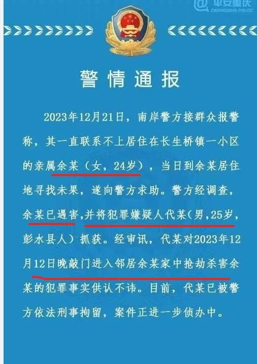 在家人的报警后,重庆市公安局南岸区分局迅速展开调查。昨天(1月4日),官方微博发布警情通报,确认了女孩余某的遇害,犯罪嫌疑人代某(男,25岁,彭水县人)是其邻居。通报中提到,案发当晚,凶手敲门进入余某家中抢劫杀害,而代某已经被警方依法刑事拘留,案件正进一步侦办中。