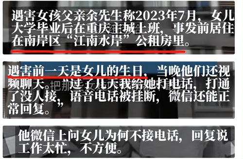 在12月12日的深夜,24岁的余某在重庆南岸区江南水岸小区的家中,遭到了邻居代某的抢劫杀害。她的家人因联系不上她而报了警,最初的寻人启事中,家人提到她在晚上7点多以后回到家就没再出去过。这一失踪的消息让人们对江南水岸小区的安全性产生质疑,而真相更加令人震惊。