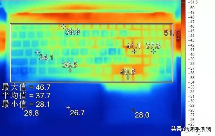 在高负载的情况下,看键盘表面温度,可以看出隔热能力,隔热能力一般,键盘表面温度高,用着就感觉烫手。特别是游戏本,在选择的时候,看玩游戏经常用到的键位是否在高温区域内。