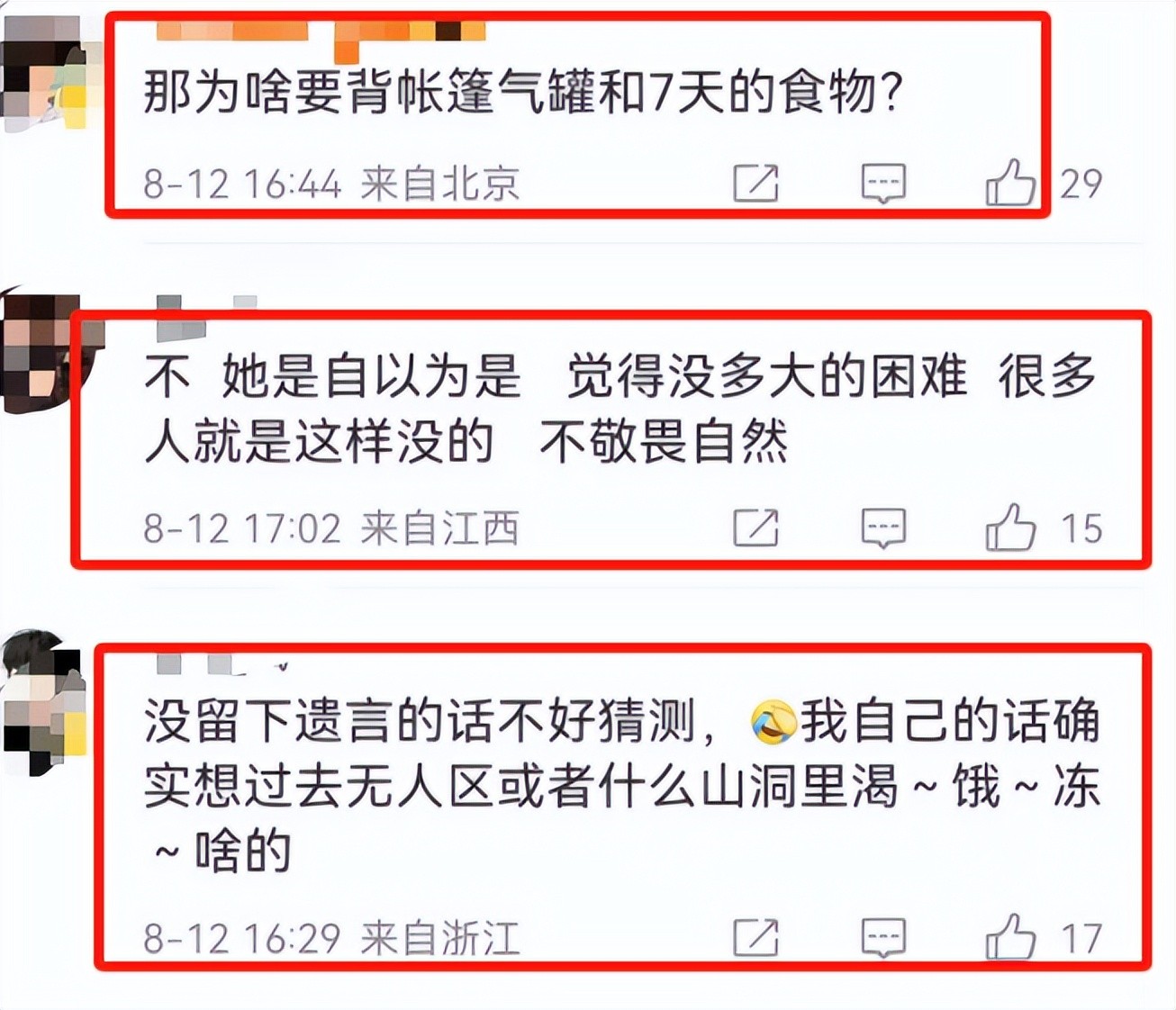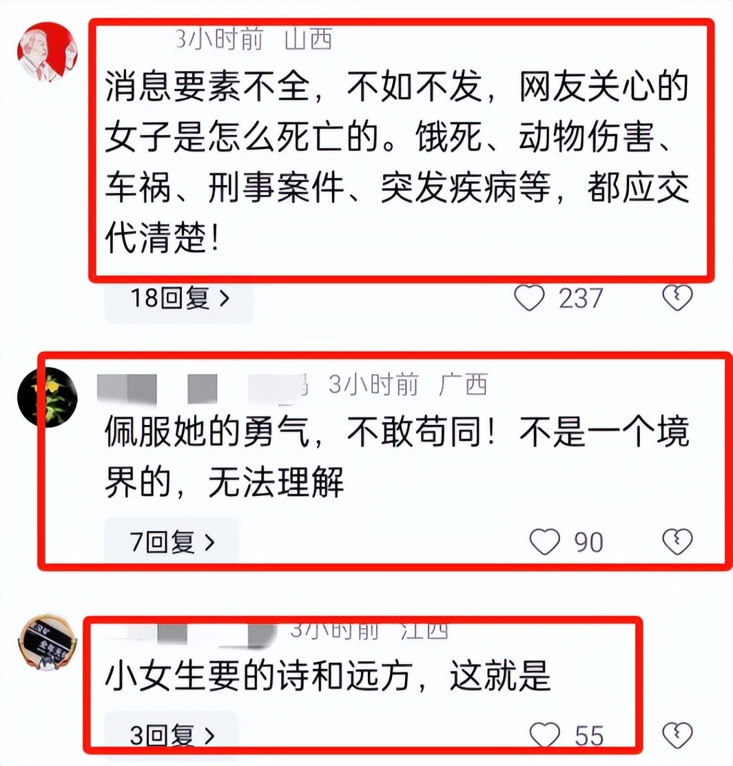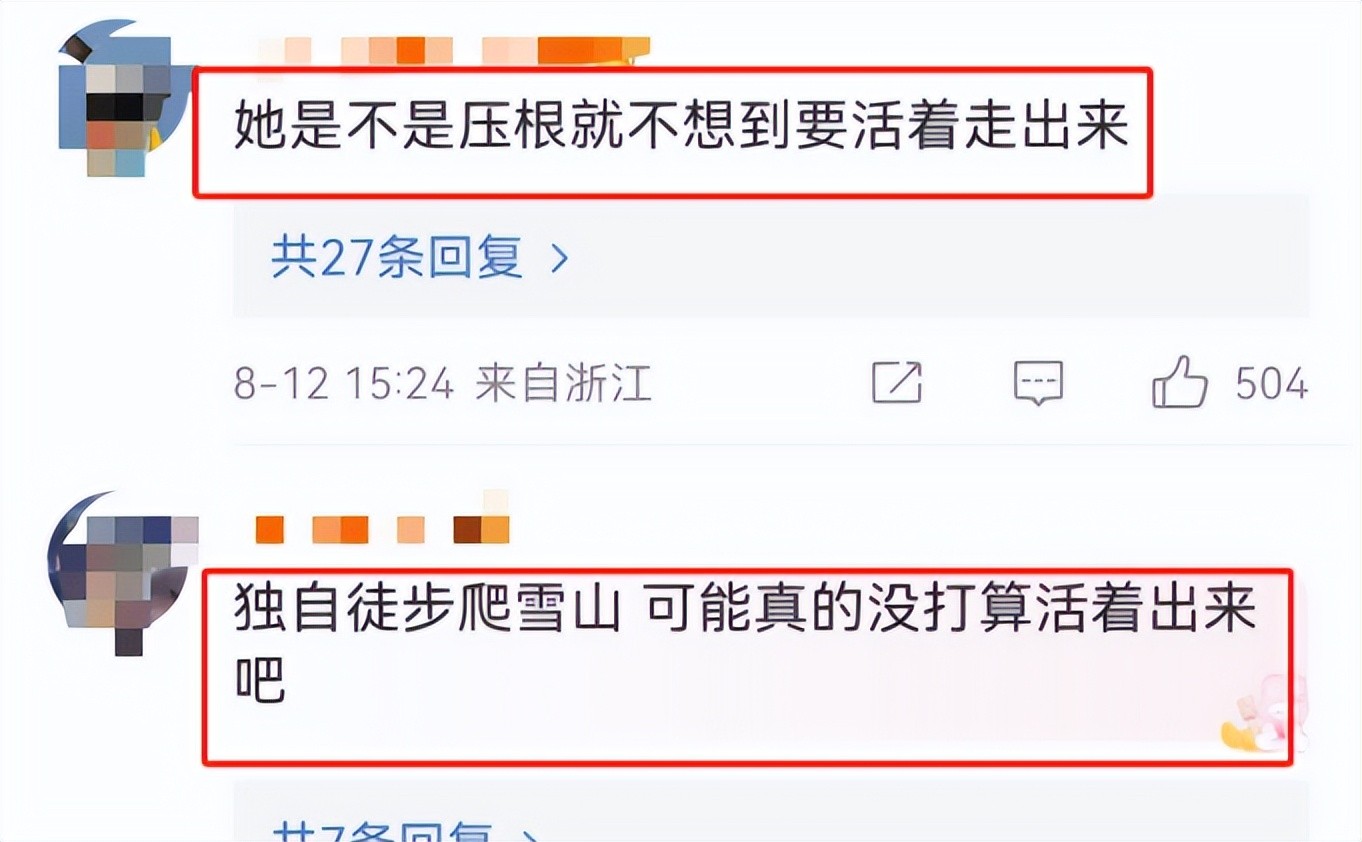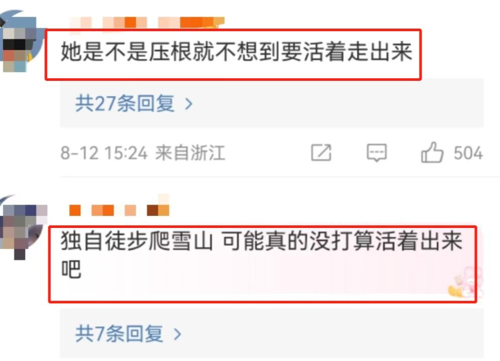 这女孩儿走了,家里人伤心死了,但网上的朋友们意见可不一样。有的猜测,她一个人去雪山,可能就没想活着回来,觉得她可能遇到了什么难处。