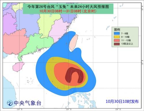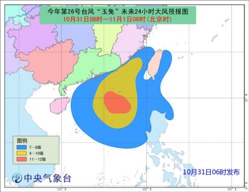 大风预报: 31日08时到11月1日08时,受“玉兔”和冷空气共同影响,台湾以东洋面、巴士海峡、台湾海峡、南海北部和中部、台湾沿海、福建南部沿海、广东中部和东部沿海有7-9级大风,阵风10-11级,其中南海东北部和中东部的部分海域风力达10-11级,“玉兔”中心经过的附近海域或地区的风力可达12级,阵风13-14级。