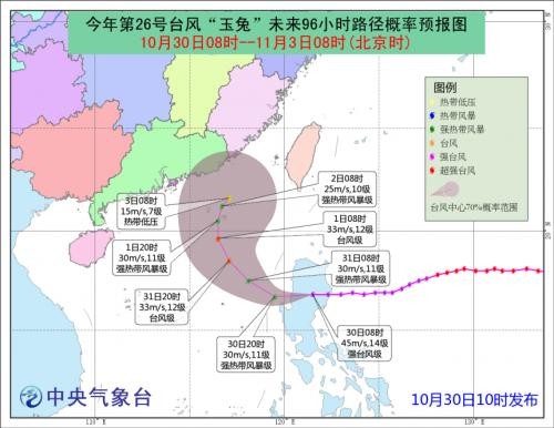 预计,“玉兔”中心将以每小时15公里左右的速度向西北方向移动,强度维持或略有增强,11月1日以后逐渐转向偏北方向移动,移速减慢,强度明显减弱,之后将在南海北部海面减弱消失。