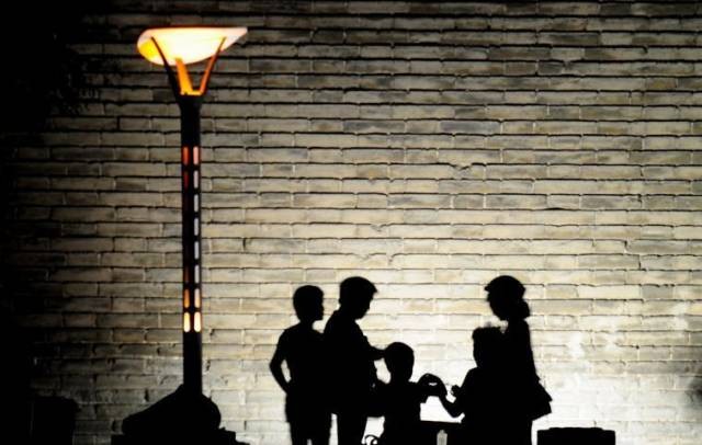 在城墙下休闲的人们的身影映衬在被聚光灯照亮的城墙上,仿佛正在演绎生活的大戏。