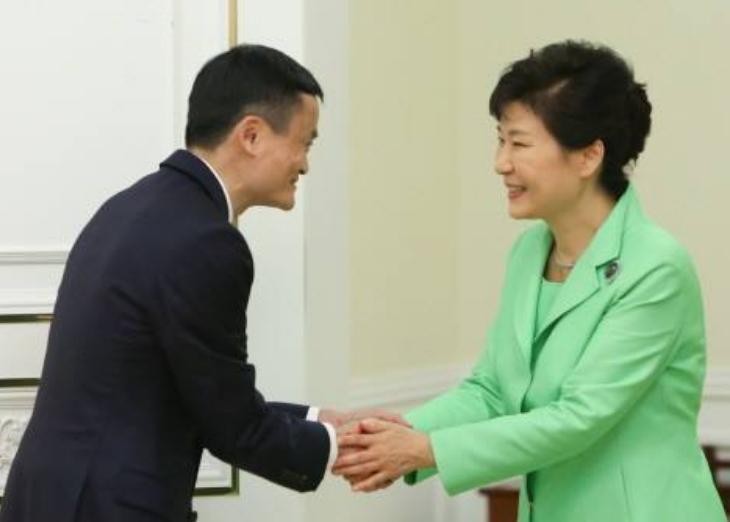 第五张“握手照”,则是他韩国第一位女总统的握手照,面对一位女性领导人,马云为了表示尊重,唯独跟她握手时,使用了双手。