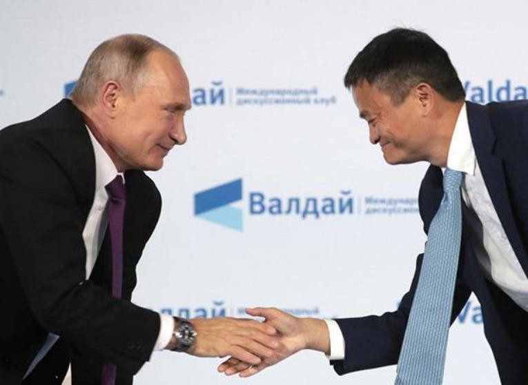 第四张“握手照”,则是他跟俄罗斯总统普及的握手照,从照片上来看,应该是马云和普京从座位上站了起来,双方弓着身子握手,使用的也是单手。