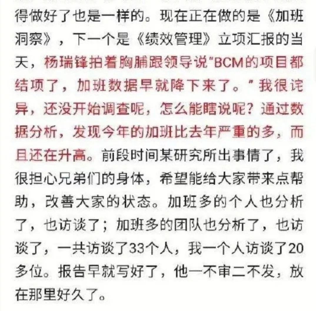 更不可思议的是,长帖中胡玲指责“杨瑞锋在向上级汇报员工加班情况的时候,竟然丝毫不依据数据”,对于胡玲做的分析和报告置若罔闻。