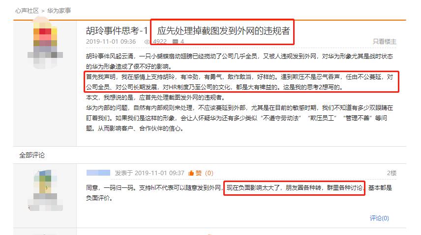 华为HR胡玲在华为心声论坛发帖
