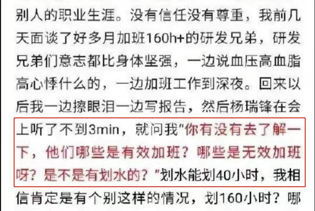 3、部分员工无加班费月加班超过160个小时,杨表示,某些员工在加班时间去健身房,这算是无效加班,是“划水”,但工程师本身是免费加班;