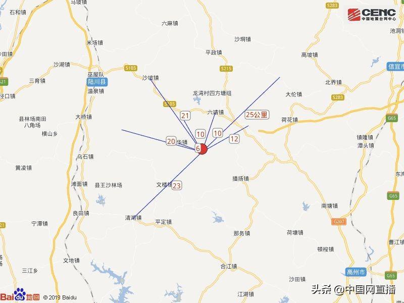 周边县城:震中距陆川县30公里、距广东高州市46公里、距广东信宜市49公里、距博白县56公里、距广东化州市59公里,距玉林市63公里,距南宁市235公里。