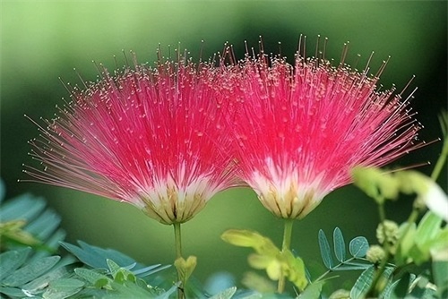 合欢树是一种落叶乔木,高可达16m,非常高大耐看。而合欢花又是非常的可爱,呈粉红色或紫红色,花萼是管状的,一簇一簇地绽放在枝头,满满的少女心。高大的树干与娇艳的花朵搭配,真的是美不胜收!