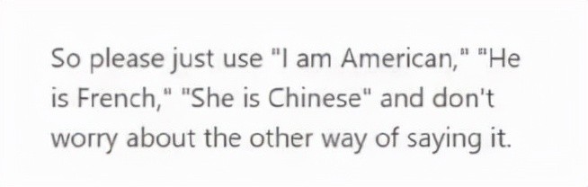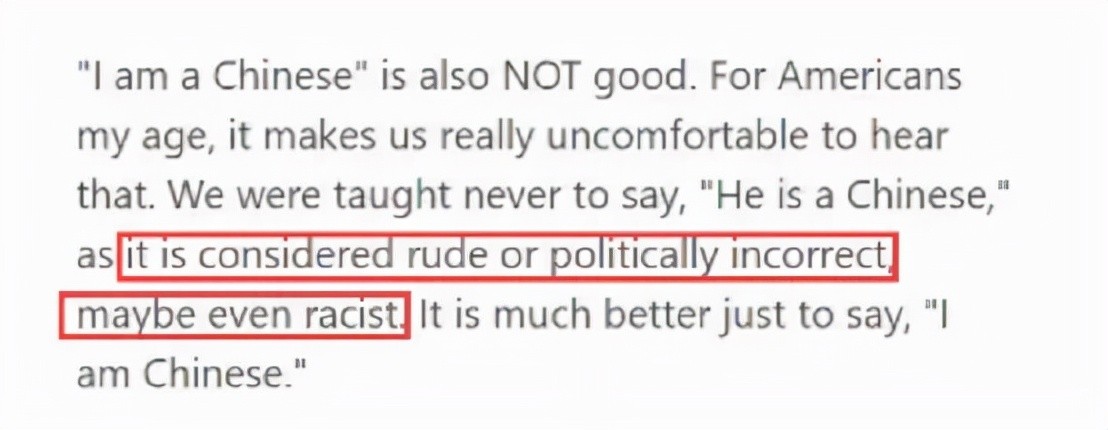 “a Chinese”这种说法被认为是粗鲁、政治不正确甚至是种族歧视的。所以在当今这个时代,唯一正确的说法是 “I’m Chinese”。