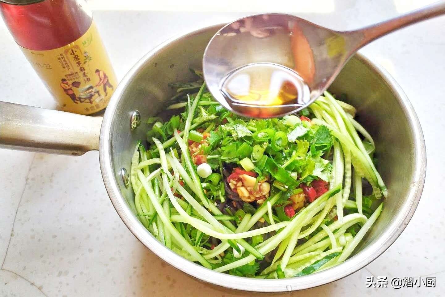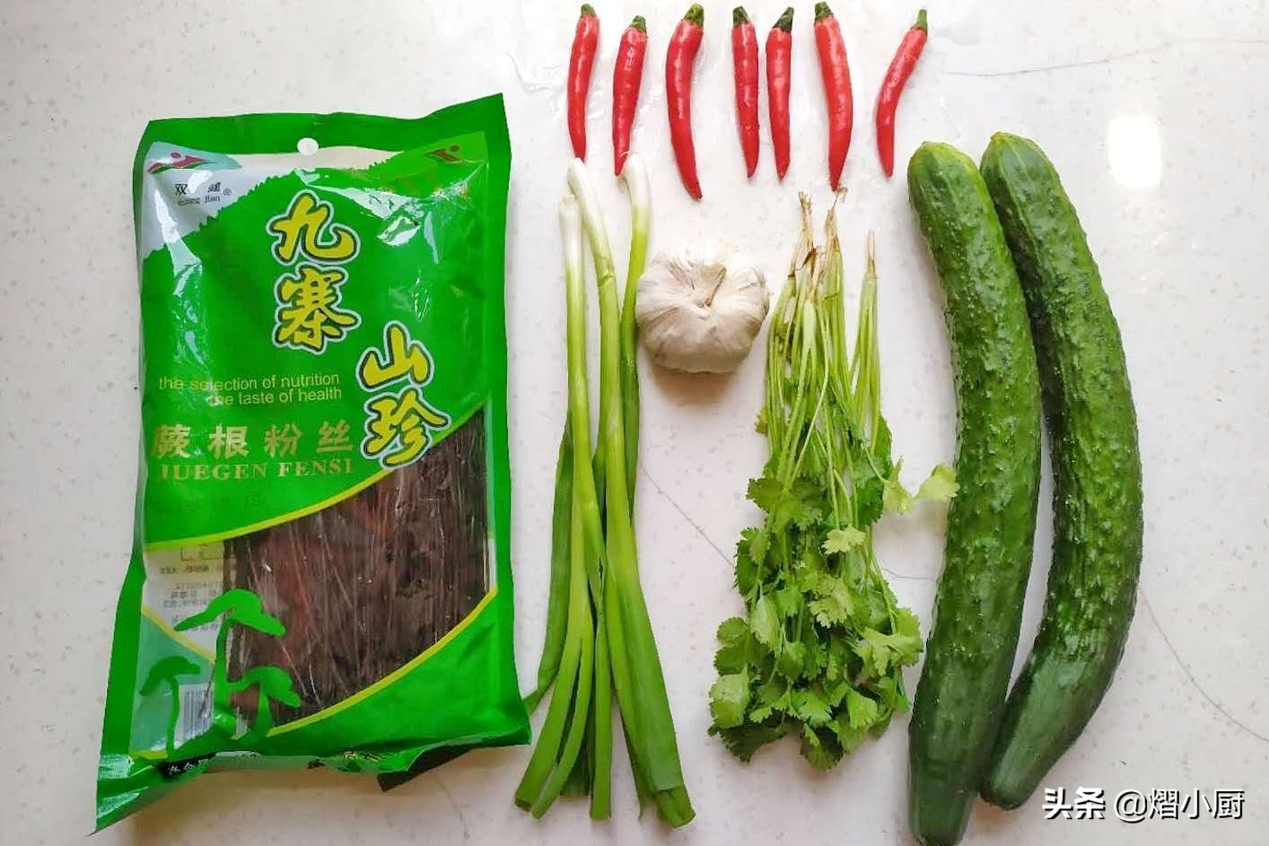 所需食材:蕨根粉,黄瓜,小葱,香菜,蒜,小米辣,盐,白糖,生抽,香醋,油泼辣椒面,香油