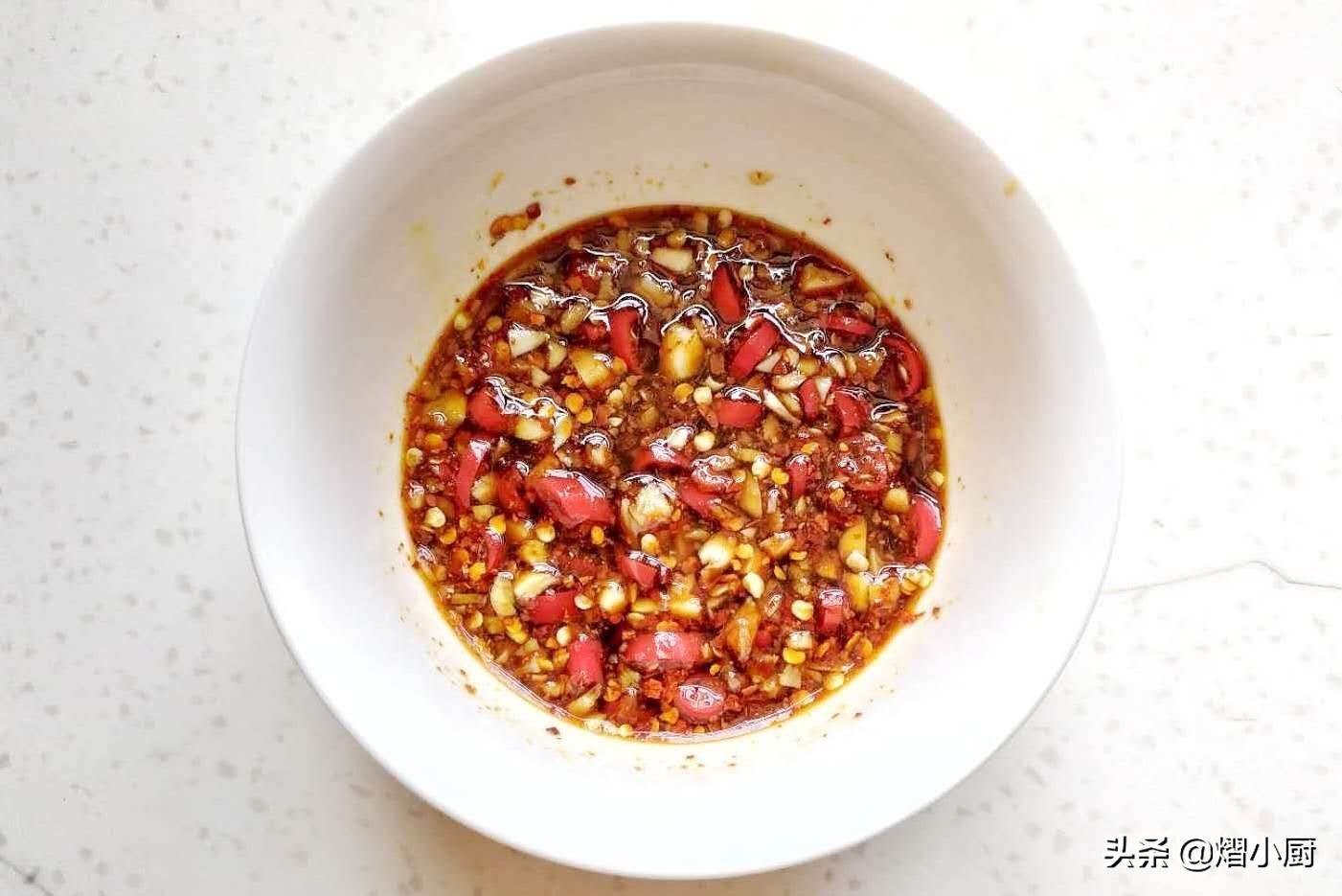 1、调料汁:取一空碗,将切好的蒜末和小米辣圈放入碗中,加入1勺白糖、1小勺盐、1勺香醋、1勺生抽,1勺油泼辣椒面,搅拌均匀,调好的料汁味道清淡不腻、鲜辣不燥、酸甜适口即可。